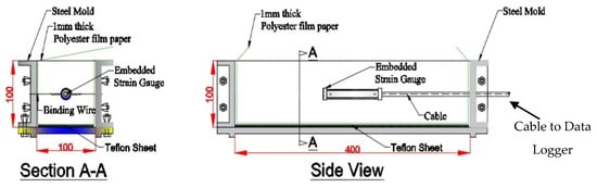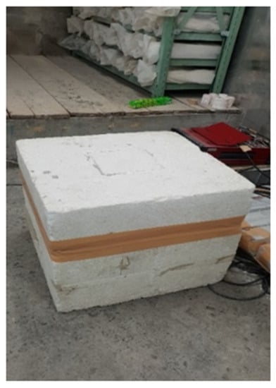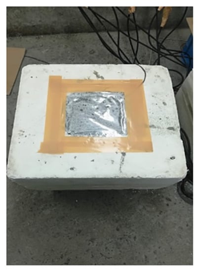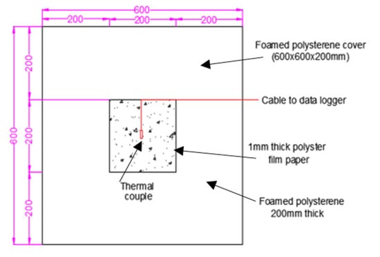 The main tests for the fresh concrete properties, which included slump, temperature, and air content, were measured as recommended by JIS or ASTM standards [,,,,,,,,]. Concrete specimens were prepared to measure concrete strain using transducer strain gauges installed in the central portion of 100 × 100 × 400 mm beam molds. The transducer strain gauges were then connected to the data logger as shown in Figure 1. Compressive strength tests were conducted using concrete specimens cast in the 100 mm diameter and 200 mm height cylinder molds in accordance with JIS A1108: 2006—method of test for compressive strength of concrete [] and ASTM C39/C39M-18: 2018—standard test method for compressive strength of cylindrical concrete specimens []. To measure the rise in concrete temperature due to cement hydration under the semi-adiabatic condition, cubic molds with internal dimensions of 200 mm consisting of foamed polystyrene of 200 mm thick, were used as shown in Figure 2, Figure 3 and Figure 4. Setting time of concrete was measured in accordance with JIS A 1147: 2007—method of test for setting time by penetration resistance [] and ASTM C403/C403M: 1999—standard test method for time of setting of concrete mixtures by penetration resistance []. The mold containing the concrete specimen for setting time was immediately covered and stored in the temperature-controlled room at 20 °C.