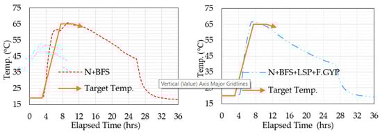 Temperature history for accelerated curing. N—ordinary Portland cement; BFS—ground granulated blast-furnace slag cement; LSP—limestone powder; F.GYP—fine gypsum.