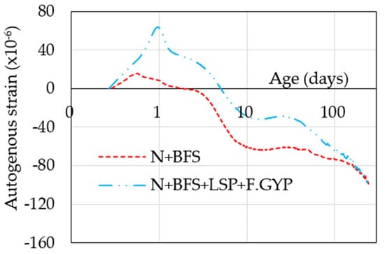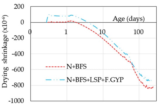 Figure 7 shows the autogenous shrinkage during and after accelerated curing. To obtain autogenous shrinkage, the total strain, which is the sum of thermal strain and the autogenous strain, was observed in the experiments. The coefficient of heat expansion of concrete was taken to be 10 × 10−6/°C []. Thus, the difference between a total strain and thermal strain provided the observed autogenous strain. N + BFS + LSP + F.GYP showed higher expansion during accelerated curing and slightly lower shrinkage after accelerated curing. Figure 8 shows the observed drying shrinkage in which N + BFS + LSP + F.GYP showed slightly lower shrinkage value throughout the experiment period.