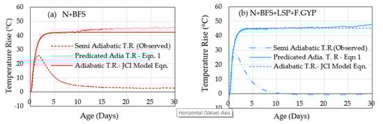Thermal cracking may occur in concrete members due to a rise in concrete temperature as a result of cement hydration. The rise in concrete temperature can be determined by subjecting concrete to adiabatic or semi-adiabatic condition. In this study, temperature rise due to heat of cement hydration was determined in semi-adiabatic condition to check the effect of limestone powder and fine gypsum. The observed results are shown in Figure 9a,b. The predicted adiabatic temperature rise of concrete was determined using results obtained in semi-adiabatic condition and Equation (1). This equation is based on the relationship between semi-adiabatic temperature rise and adiabatic temperature rise as proposed from the past research work on a simple thermal insulation test []:
