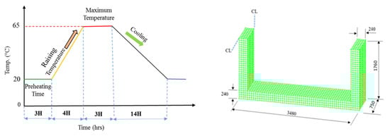 In 3D FEM analysis, fresh concrete properties such as concrete temperature are used as one of the input parameters. In this study, slump values obtained were used only to check the workability of concrete, which is key when making precast concrete units for easy of placement, consolidation, and finishing. Setting time of concrete was used to determine the start time for both autogenous shrinkage measurement and accelerated curing. A 3 h delay period was adopted even though longer setting times were observed in mix proportions but were within the generally used delay period of 2 to 5 h in many precast factories. In this paper, setting time was used as the starting point for measuring autogenous shrinkage. A curing process of one day, which is generally used in civil engineering precast concrete products, was adopted in both accelerated curing and 3D FEM analysis [].