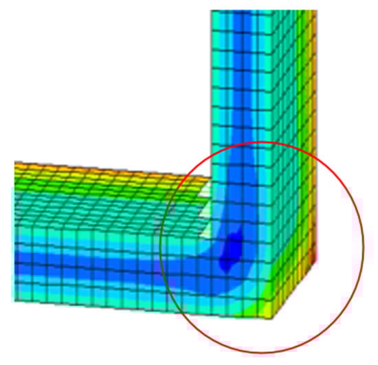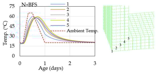 Thermal analysis and stress analysis were conducted in 3D FEM analysis. In the thermal analysis, heat transfer analysis was carried out using the adiabatic temperature rise of each mixture. In stress analysis, the coefficient of thermal expansion of concrete was taken to be 10 × 10−6/°C and autogenous shrinkage under accelerated condition also taken into account. Figure 10, Figure 11 and Figure 12 further provide location and temperature profile at the region with a low thermal cracking index observed in the center of the precast model member. It can be seen that the difference in concrete temperatures between the surface and internal concrete as shown in Figure 13 generated tensile stresses. Similar high thermal stresses were observed at 1 day in both concrete mixtures that showed thermal cracking index values of 0.69 in N + BFS and 0.76 in N + BFS + LSP + F.GYP. The observed values may lead to surface cracking of the precast concrete model specimen at demolding time.