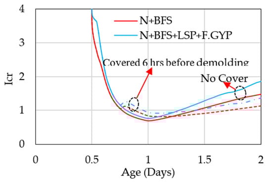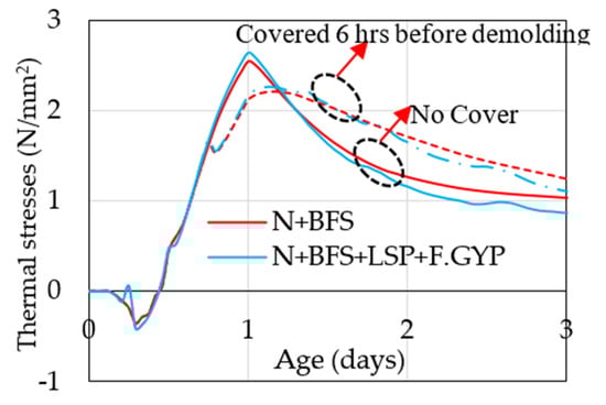 An input option to check the effect of covering precast concrete molds during accelerated curing was then introduced in 3D FEM analysis. All the outside surfaces were covered using curing sheets with 6 W/m2 °C heat transfer coefficient []. This type of curing sheet provides more resistance to heat transfer that may reduce the temperature difference between the surface and internal concrete. Then, the optimum time for covering the molds was investigated. There was a reduction in thermal stresses in both concrete mixtures covered 6 h before demolding as shown in Figure 14. This resulted in a reduced temperature gradient in concrete that improved the thermal cracking index. The change in the thermal cracking index before and after the introduction of curing sheets is provided in Figure 15 and Table 9.