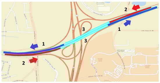 Definition of three segment types at an interchange: (1) merging in blue, (2) diverging in red, and (3) within in cyan.