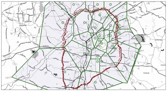 Table 1 also includes weather data that was obtained from Weather Underground []. The four major features of weather data collected are precipitation rate, precipitation accumulation, gust, and wind speed. The Weather Underground contains tabulated datasets of weather taken from localized weather stations at varying rates, these intervals range from five to fifteen minutes. Data from all weather stations surrounding I-285 were obtained over the same eight-month study period. The weather data was matched with crash both temporally and spatially. Specifically, weather stations were spatially paired with crashes through the implementation of a Voronoi diagram in Figure 2.