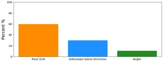 The driver-related factors or features are shown in Table 2, including the age of the driver at fault and one-hot-encoded categorical variables, such as reckless driving, driving under the influence and following too closely, as reported by the responding police officer for each accident. Finally, the distribution of multi-vehicle crash types is shown in Figure 3. As expected, rear-end collision is the dominating crash type on the interstate, followed by same-direction sideswipe and angle.