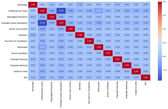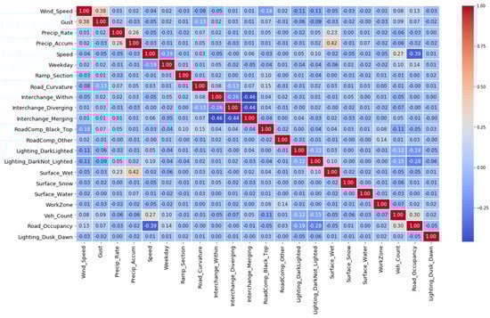To gain an understanding of how the features correlate with one another, correlation matrices were generated with correlation coefficients shown in Figure 4 and Figure 5, respectively for RTWE features and driver-related features. The correlations among the features in each feature set are relatively low.
