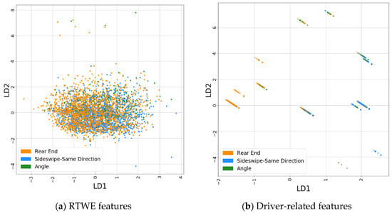 Projection of crash data in the two Linear Discriminant Analysis (LDA) axes; (a) results for RTWE feature set, (b) results for driver-related feature set.