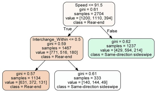 Although the nested/mixed logit models and discrete mixture models have been used for crash analysis, the common linear-in-parameter assumption limits their prowess in effectively exploring high dimensional feature space. In contrast, decision tree models are nonlinear and can effectively partition feature space in a much more flexible fashion. Machine learning and statistical learning models have been compared by Karlaftis and Vlahogianni [] and Abdel-Aty and Abdelwahab []. It was pointed out that neural networks would generate more accurate models when fitted to complex data structures. However, the elevated accuracy came at the cost of model interpretability and neural network models are often considered as black boxes. It should be noted that techniques focusing on interpreting complex models, such as neural networks, are being developed. Drawing meaningful inferences is the key to crash analysis and mitigation. However, it turns out that decision tree models often outperform statistical methods when tasked to classify data (e.g., crashes) that is not linearly separable, without the loss of interpretability induced by complex model structures, such as neural network models. For instance, Ramani and Shanthi [] compared different decision tree models in classifying collision patterns using twenty-four features. In their study, seven classification algorithms were applied, including C4.5, ID3, C&RT, CS-MC4, Decision List, Naïve Bayes, and Random Tree. It was found that the Random Tree algorithm outperformed all others. In another study, López et al. [] used the CART decision tree method to analyze accident data, in which seventeen explanatory variables were used, including characteristics of the accidents, weather information, driver, and road characteristics.
