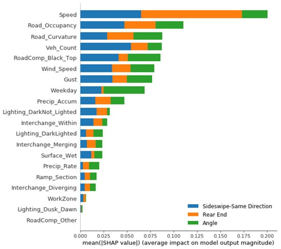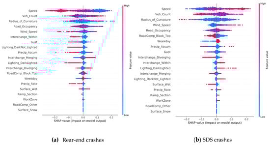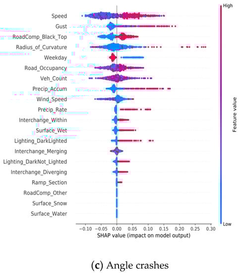 As shown in Figure 8, the top five features are speed, road occupancy, radius of curvature of the road, vehicle count, and black-top road composition. The plot also displays how relevant each feature is to each of the three crash types as indicated by colors. For instance, wet surface and black-top road compositions have a larger impact on angle and same direction sideswipe (SDS) crashes than on rear-end crashes. However, Figure 8 provides no information about if a feature is positively or negatively related to each crash type. To understand this directional relationship, SHAP values, representing the influence of features on the predictions of each class, are plotted in Figure 9 for all three crash types. The overall influence of a feature is indicated by their position on the vertical axis, which is in descending order from top to bottom. The horizontal axis shows the computed SHAP value (i.e., directional impact) of each feature for each class prediction. The color indicates the feature value from high (red) to low (blue). For example, the ‘Speed’ feature in Figure 9a is the most influential feature for the rear-end collision. The opposite direction between the color distribution and the SHAP axis (i.e., higher speeds (red) on the negative side of the axis and lower speeds (blue) on the positive side of the axis) indicates a negative correlation of speed with rear-end crashes. In other words, rear-end crashes more likely to involve vehicles with lower speeds. In contrast, speed remains the top influencer for SDS and angle crashes with a positive correlation, i.e., SDS and angle crashes likely involves vehicles with higher speeds.