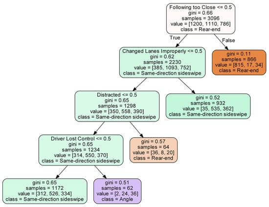Similar to the single-tree model for the RTWE feature set, we also constructed a single tree model for the driver-related feature set for illustration purposes, as shown in Figure 10.