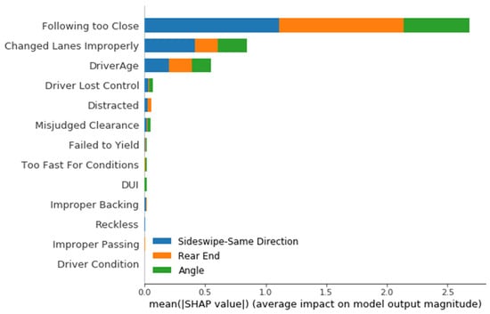 The top three features (i.e., following too close, changed lanes improperly, and driver age) dominate the utility of this model. There is an intuitive and logical connection between following too closely and improperly changing lanes with both rear-end and SDS crashes, as indicated by the longer bars in blue and orange in Figure 11. In addition, SHAP values were computed for each collision type and are plotted in Figure 12.