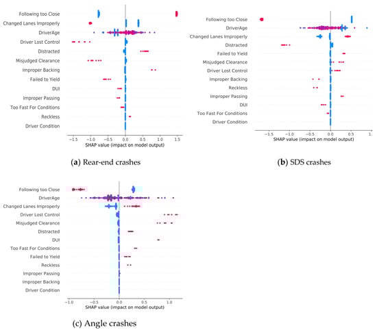 Effects of driver-related features; (a) SHAP value plot for rear-end crashes, (b) SHAP value plot for SDS crashes, (c) SHAP value plot for angle crashes (note: red indicates high feature value and blue indicates low feature value).