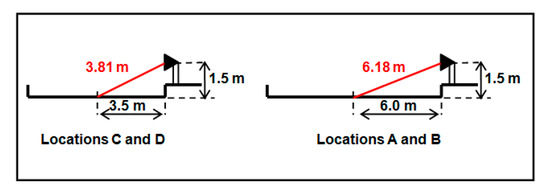 The phonometric measures have to be corrected for the locations A and B according to the distance from the centre of the road; indeed, as reported in Figure 2, the distances are different in these locations since there are parking lots (the measures were, anyway, performed where no cars were parked). Assuming a linear noise source, the sound in locations A and B arrives to the receptor attenuated by the following factor: