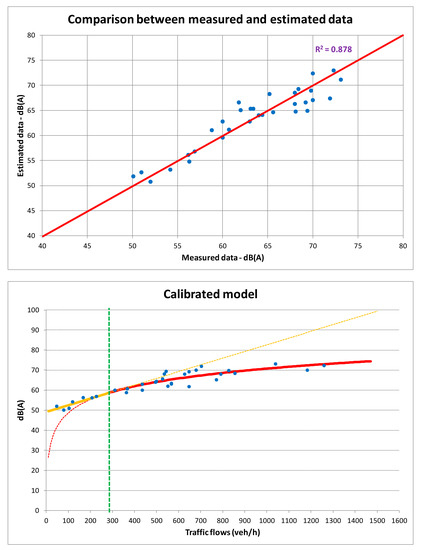 On the other hand, in practice, in particular for urban roads, there is always background noise to which the noise emitted by vehicular traffic is added. The approach proposed in this paper, based on the use of a piecewise-defined function to be calibrated for the specific context, makes it possible to use the calibrated model even on roads with very low or no traffic.