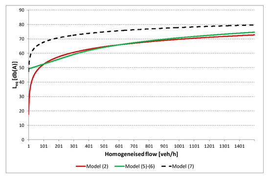 we can see that it is not applicable in case of null flow (the second term would tend to less infinite) and would give a value equal to 17.594 dB(a) in case of 1 veh/h and 34.971 in case of 10 veh/h. As also written in [59], the model is valid only if the flow is greater than about 50 veh/h, at which the equivalent noise level is equal to 47.1 dB(A).
