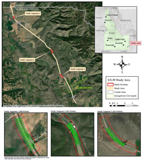 The study area, shown in Figure 1, consists of three approximate tenth-mile segments of US-30 in southeastern Idaho near Georgetown, corresponding roughly to mileposts 414, 419, and 422, respectively. Conventional survey cross-section points including elevation were collected for the Idaho Transportation Department (ITD) by Dioptra Geomatics on these segments to verify the accuracy of the mobile-terrestrial lidar featured in this study. Each of these areas was specifically chosen as an area that the mobile-terrestrial lidar may have difficulty with accuracy off the road surface. In this study, the verification purpose of the conventional survey has been expanded to the aerial lidar and UAV photogrammetric capture data covering the same general areas. All four datasets (aerial lidar, mobile-terrestrial lidar, UAV photogrammetric capture, and traditional survey cross-section points) were obtained from ITD.