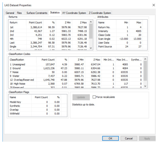 The .las files were added to a new ArcMap document, and only ground return was selected to produce DEM surfaces. Lidar data typically includes a large number of points for returns other than bare ground, so this is an important step, necessary to produce a model of the ground only. Figure 2 shows the properties of the aerial lidar LAS Dataset: