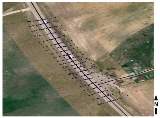 DEM surfaces were generated from the .las files, and these outputs were visually evaluated to ensure they covered the conventional survey points at each road section. Elevation data was then extracted from each DEM for each covered conventional survey point for aerial, mobile-terrestrial, and UAV data by using the Extract Values to Point (Spatial Analyst) tool. This process allowed for finding the elevations at the same horizontal points for the different data sources to statistically compare them. Figure 3 shows the survey points imported in ArcMap for a section of our study area.