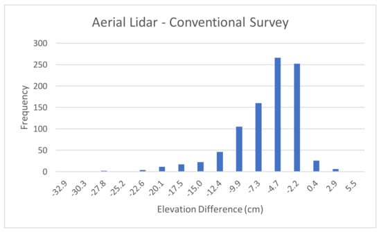 To find a confidence interval around the mean elevation difference the first step needed is to determine whether the differences are normally distributed. To this end, histograms were constructed for all differences described in Table 2, Table 3, Table 4, Table 5. Figure 5 depicts the histogram for the difference between elevations computed using aerial lidar and conventional survey data. The mean for the differences, as noted in Table 2, is −7.48 cm. The figure shows that the histogram is not centered around this mean; the diagram is skewed to the left. There were also some outliers with high negative elevation difference