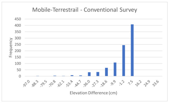 Figure 6 depicts a similar histogram of differences between the mobile-lidar based elevations and the elevations estimated using conventional survey. The mean of the differences for this case is −9.04. The histogram does not imply that the distribution of differences is centered around this mean value. The figure also shows that there some outliers in this data set.