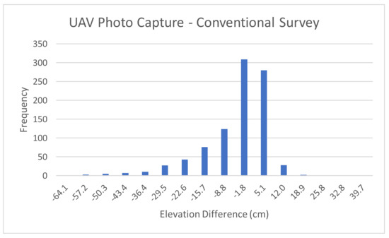 Figure 7 depicts the histogram of differences between the UAV photogrammetric capture data based elevations and the elevations estimated using conventional survey. The mean of the differences for this case, as shown in Table 2, is −7.79 cm. The histogram shows that the elevation differences are not normally distributed around this mean. The figure also shows that there are some outliers in the data.