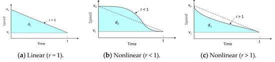 Illustration of linear and nonlinear deceleration profiles. (a) Linear (r = 1); (b) Nonlinear (r < 1); (c) Nonlinear (r > 1).