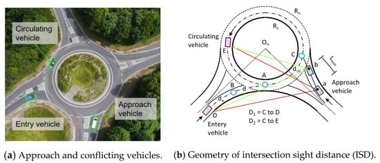 Intersection sight distance (ISD) plays a crucial role in the design of roundabouts. Adequate ISD is required for a driver at each entry of the roundabout to identify safe gaps from conflicting traffic streams. More specifically, ISD should be checked at two locations of the approach vehicle at each entry: (1) a certain distance before the crosswalk and (2) a stationary vehicle at the yield line. Drivers at these locations should clearly see the two conflicting vehicles: circulating and entering from the immediate left. The current methods for calculating ISD are deterministic. Such methods are presented in the roundabout information and design guides by Rodegerdts et al. []; the Transportation Association of Canada []; the American Association of State Highway and Transportation Officials (AASHTO) []; the Federal Highway Administration (FHWA) []; the Government of Queensland (GQ) []; and the Department for Regional Development, Northern Ireland (DRDNI) []. However, the ISD design parameters, such as design speeds, deceleration rate, and critical headway for the conflicting vehicles are random variables in nature instead of fixed values, and they may be correlated with one another.