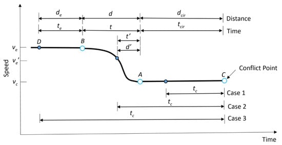 where a1, a2, and a3 denote the deceleration rate (m/s2) that corresponds to Equations (1)–(3), respectively; ve and vc denote the entry and circulatory speeds (m/s); d denotes the deceleration distance (m); and t denotes the deceleration time (s).