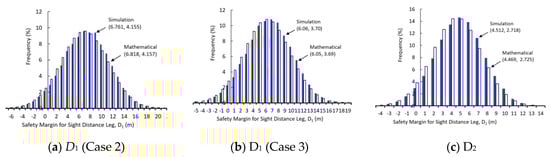The simulation involved generating 30,000 random values of the component random variables of the respective equations for D1 (ve, vc, tc, a, and r) and D2 (vc, tc). The probability distributions of the component random variables were assumed to be normal, with the means and standard deviations calculated from the data. The generated random values of the component variables were then substituted into the respective equations, resulting in 30,000 values of the dependent random variable. Using these values, their means and standard deviations were calculated along with their histograms. The reliability index was β = 1.64 (Pnc = 5%). For D1 (Case 2), the mean and standard deviation of the safety margin of the mathematical model were ], = 6.818 m and σSM1 = 4.157 m, compared with the simulation values of 6.761 and 4.155 (Figure 4a). The results for Case 3 were also very close (Figure 4b). For D2, the mathematical and simulated values were (4.469, 2.725) and (4.512, 2.718), respectively (Figure 4c). As noted, the means and standard deviations of the simulation and mathematical formulas show excellent agreement. In particular, the close standard deviations of the mathematical and simulation methods verify the rather complex first derivatives of Cases 2 and 3 of D1. In addition, the simulation results show that the probability distributions of the design variables are very close to the normal distribution.