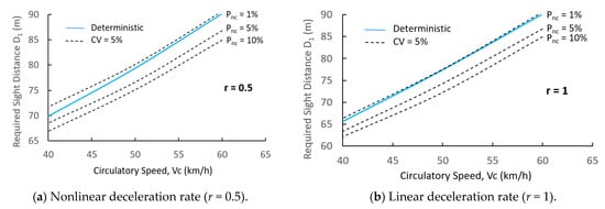 Design values of D1 and D2 were established using the reliability-based method of Equations (41) and (46), respectively, for CV = 5% and 10% and Pnc = 1%, 5%, and 10%. For D1, the values were established for different combinations of Ve and Vc and for linear (r = 0.5) and nonlinear (r = 1.0) deceleration profiles, as shown in Table 4. As noted, larger design values are required for a larger CV and smaller Pnc. The deterministic values are also shown in the table. A comparison of the deterministic and reliability-based values for Ve = 60 km/h of Table 4 are shown graphically in Figure 5. As noted, the deterministic values correspond to a low probability of non-compliance (about Pnc = 1%), indicating that such values are conservative. This finding is consistent with that of Easa [], where the deterministic values for uncontrolled intersections corresponded to a very small probability of non-compliance. This is not surprising, since the deterministic method uses very high or very low percentile values (depending on the nature of the random variable). Note also that the trends of the design values for the linear and nonlinear deceleration profiles are similar, except that the values for the nonlinear profile (r = 0.5) are greater, as previously discussed.
