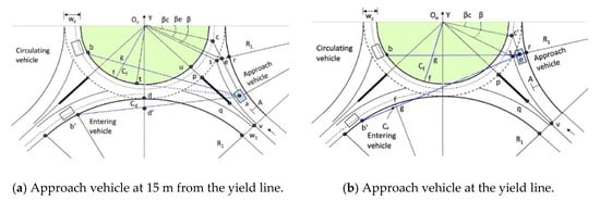 where dcir denotes the distance along the circulatory part of the path; d denotes the distance during deceleration, given by Equation (7); and de denotes the distance along the entry curve. The distance de equals the entry speed ve multiplied by the time te, which corresponds to de.