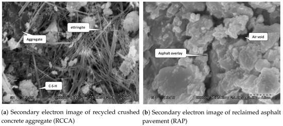 Microstructural study of different heterogeneous materials such as RCCA and RAP treated with lower amount of cement illustrates distinctive hydration products. Density, shape, and size; pore structure, stability, and strength are the main properties of the aggregates that influence concrete behavior [28]. In the microscopy study of concrete calcium hydroxide (CH), tricalcium disilicate hydrate (C-S-H), pores and residual hydrated cement are the significant components to be analyzed. Various field image analysis processes have been developed to analyze the quantity and quality of these properties [14]. C-S-H is mostly responsible for the behavior and strength of the hardened cement. RCCA and cement paste have almost similar chemical behavior [29]. RCCA consists of significant amount of fine aggregates which are basically old mortar. The presence of ettringite (spike like crystal) helps to distinguish between natural and recycled aggregates. 3CaO·SiO, 2CaO·SiO and 3CaO·AlO and the solid solution with average composition 4CaO·AlO·FeO are the fundamental components of cement [28]. During hydration, 3CaO·AlO reacts with gypsum CaO·SO·2HO to sequentially form hydrous calcium aluminum sulfate ettringite CaAl(SO)(OH)·26HO and monosulfate. These are the initial reactions which occur during the first 24 h of hydration. Further reactions produce C-S-H which strengthen the material [29]. Figure 3a illustrates the presence of ettringite and C-S-H. However, RAP usually does not undergo hydration reaction due to its asphalt overlay. RAP aggregates are partially or fully covered by bituminous binders that prevent them from reacting with cement. In Figure 3b, round crooked shaped asphalt overlay incorporated with air voids, is detected.