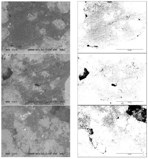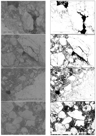 For instance, Figure 4 and Figure 5 present the binary conversion from scanning electron microscopic image for 30% RAP, 70% RCCA and 100% RAP, 0% RCCA stabilized with 6% cement respectively. The larger pores correspond to entrapped air bubbles due to inadequate compaction. In RCCA these pores are gradually filled by hydration reaction with residual cementitious material and newly formed CH [19,28]. Asphalt overlay restricts the RAP aggregates from the reaction thus making them unable to fill the pores.