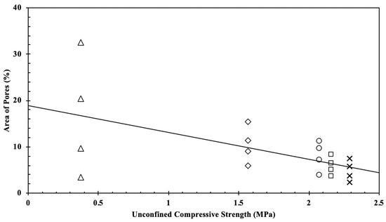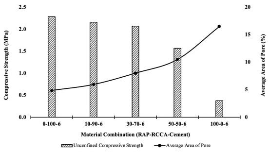 In Figure 6 compressive strength is represented along with the average percentage of pores for different combinations of RCCA and RAP treated with 6% cement. Compressive strength decreases with increase in percentage of pores as shown in Figure 7. Due to the increase of hydrated compounds with hydraulic properties, amount of pores reduces; thus the compressive strength increases [33]. In aggregate blends, higher percentage of RAP aggregates create more voids compared to RCCA. As hydration products tend to migrate into pores, RCCA pores get filled up. Interfacial transition zone (ITZ) is often found along the weakest part of the concrete [34]. Asphalt overlay created porous ITZ resulting in weaker bonding between them. As shown in Figure 7, the average area of pore shows a decreasing trend with increase in compressive strength, which is decreasing the intrusion of RAP material.
