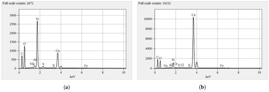 Energy Dispersive X-ray Spectrum of (a) 0% RAP + 100% RCCA + 6% cement (b) of 100% RAP + 0% RCCA + 6% cement.