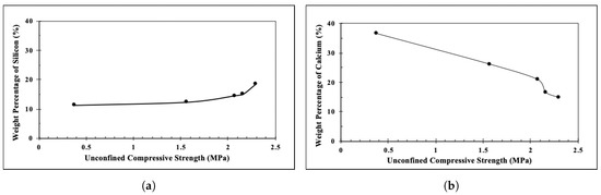 Weight percentage of (a) Silicon and (b) Calcium with the variation of compressive strength.