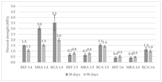 The reduction of cement reduces the mechanical strengths of the mortars. However, the incorporation of RCA may improve these properties. The modified mortar RCA 1:5 had an increase of 17% and 34% of the compressive and flexural strengths at 90 days, respectively, compared to REF 1:4. Nonetheless, RCA 1:6 presented a slight decrease, which did not considerably affect its performance. These improvements in the modified mortars with RCA could be explained by a filler effect and the non-hydrated cementitious particles in the waste that were hydrated by the mixing water.
