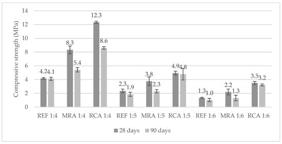 However, the incorporation of FRA (both RCA and MRA), for the same cement ratio, reduced the amount of water needed in the mortars due to a filler effect. Those particles filled voids between the constituents, instead of water. Modified mortars poorer in cement (MRA 1:5, MRA 1:6, RCA 1:5 and RCA 1:6) needed less water to maintain an adequate consistency relative to REF 1:5 and REF 1:6. However, this decrease was not enough to reduce the water/binder ratio compared to REF 1:4. Other authors found the same trend [,,,].