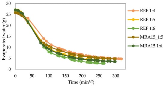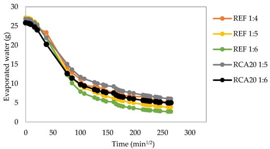 Figure 3 and Figure 4 present the evaporation curves over time. From these curves, it is possible to evaluate the mortars’ drying behaviour. The same specimens used to analyse the capillary test were submitted to this test. The reduction of cement interfered in the drying performance of the mortars. This reduction led to faster evaporation rates, which is related to the porosity of the mortars. The reduction of cement content increased the porosity of the mortars, improving their drying behaviour.