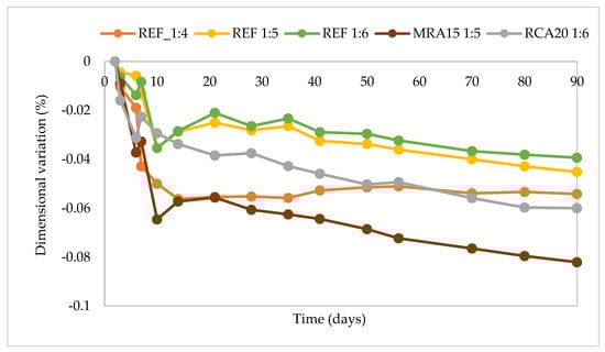 The results of the dimensional variation test are presented in Figure 5. The dimensional variation test was performed up to 90 days. However, it can be seen that the largest dimensional variation of the specimens occurred at an early age.