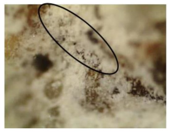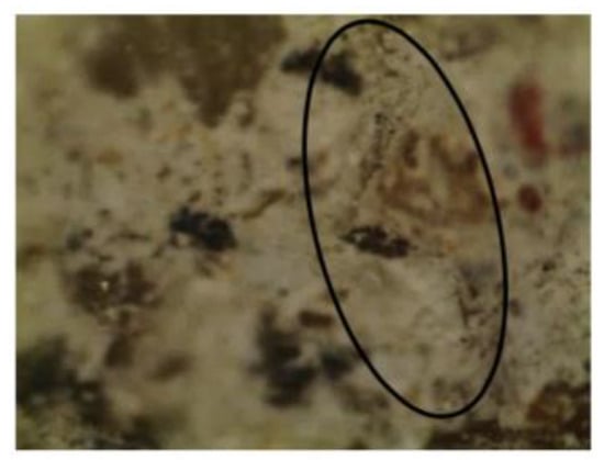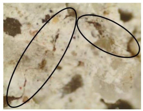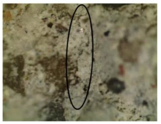 An electronic magnifying glass was used to observe the specimens with magnification of 700% and the results are presented from Figure 6, Figure 7, Figure 8 and Figure 9. The REF 1:6 and RCA 1:5 mortars presented an isolated micro-cracking pattern. However, in MRA mortars, a few cracks were also observed. Additionally, as expected, RCA 1:5 and REF 1:6 had a more compact matrix than the other mortars.