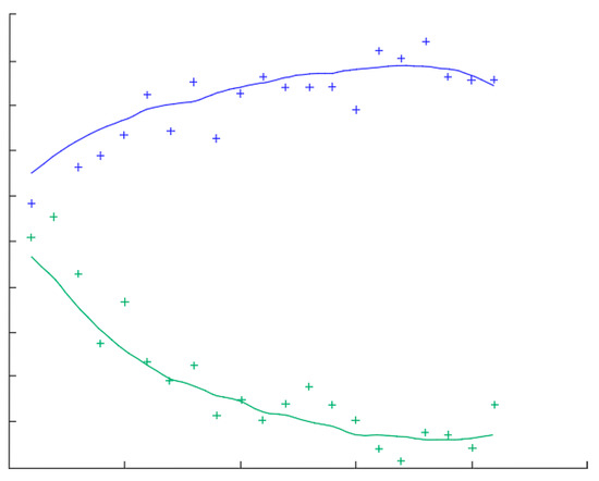 The Savitzky–Golay filter used is a digital low-pass filter that allows to make the data trend more continuous; it is applied to a series of data points in order to decrease the signal noise without deforming the signal. The subsets of consecutive data points are fitted using a low order polynomial with linear least square method, so the convolution of all the polynomials is then obtained [46]. The data, having a set of n {xj, yj} points, where j = 1, 2, …, n, and x is an independent variable, whereas y is an observed value, can be represented with a set of m convolution coefficients Ci; the effect of convolution can be expressed as a linear transformation: