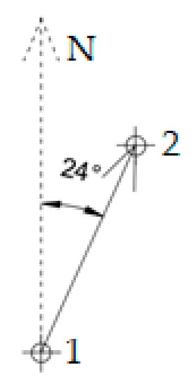 Initially, a denser discretization of the axis was carried out, measuring the distances between two consecutive vertices and dividing the segments longer than 6 m. For each point the Cartesian coordinates, the elevation, the identification code, the azimuth of the segment linking the i-th point to the next one (see Figure 6), the slope (m) and the y-intercept (q) of the straight line passing between the 2 above points, the partial length and, lastly, the distance have been tabulated, as shown in Table 1.
