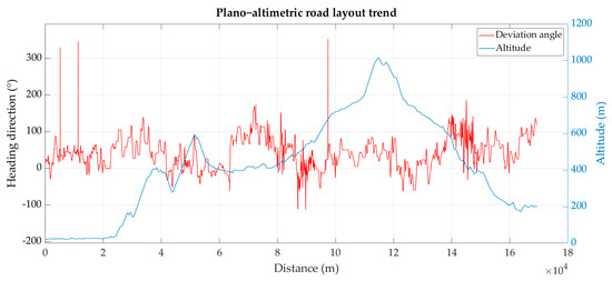 Once the azimuth (or heading angle) of each segment that composes the graph has been calculated, its trend and the elevations have been represented in a diagram as a function of the distance, as shown in Figure 7: