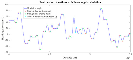 Subsequently, again by means of the programming code, a further method to determine the starting and ending points of the straight lines has been developed, through the analysis of the heading angle. A straight line has constant heading all the way along it, so in the distance–heading direction diagram, it is possible to identify in each plateau the elements with zero curvature. On the contrary, the circular arcs are represented by linear variations of the heading angle; conventionally, positive slope of the heading angle trend corresponds to right-handed curves; the negative slope corresponds to left-handed curves. When there are linear variations with a positive slope immediately followed by variations with a negative slope, or vice versa, in which no section with a zero slope is interposed, the points of reverse curvature can be identified at the vertices of the cusps.