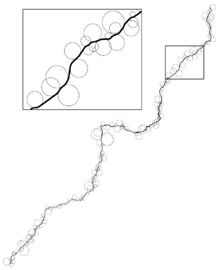 As shown in Figure 10, the Italian highway S.S. n. 4 has been completely geometrized by a succession of curves and straight lines; all the circumferences obtained by the previously described method, implemented in the original programming code, have been imported into the CAD (Computer-Aided Design) environment.