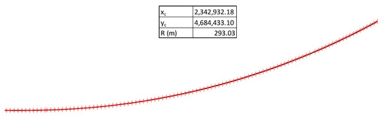 Figure 11 shows an example of a circumference computed by the circle fitting procedure implemented in the code, in which the points used for the least squares arc evaluation—and the center and radius coordinates definition obtained as a result—are represented in red (the curve obtained is in black):