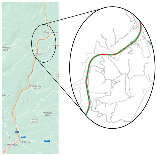 To test the accuracy of the results, after calculating the characteristic parameters of the circular arcs and the straight lines through the least square fitting, a qualitative comparison between the project axis obtained and the road layout, obtained from GIS basemaps, has been done. Even if it is not possible to consider Figure 12 as a quantitative validation, it can be noted that the two trends are overlapped in the entire distance considered.