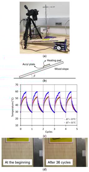 For the experimental demonstration, we applied the voltage of the power supply as and with the on-and-off time interval of the power supply as min for the total experiment time of h (i.e., total heating–cooling cycles) (Figure 1c). Ten minutes of the heating–cooling duration is found sufficiently long to attain the consistent temperature at the acryl plate. During the test, the movement of the acryl plate was monitored using time-lapse photography (photo interval of s) (Figure 1d). With the described test conditions (i.e., and of power supply for heating and and of the inclination angles), a total of 4 different cases are examined, and each case is performed twice for reproducibility. The amplitudes of temperature fluctuation are observed to be about and for and of applied powers, respectively (starting temperature is about ) (Figure 1c). There is no additional external force applied other than the temperature fluctuation during the tests. The accumulated slip is measured from the analysis of captured images of the acryl plate by the time-lapse camera, assuming the underlying wood slope is neither deforming nor moving.